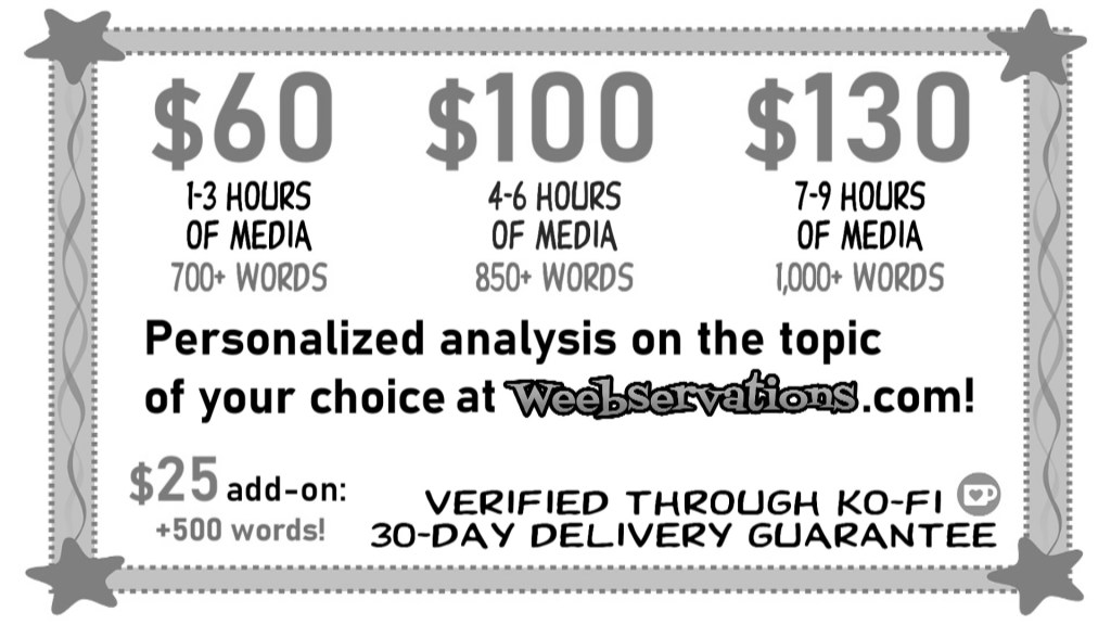 Weebservations is supported entirely through commissions from readers like you! Click here to commission me on Ko-fi for a personalized analysis of any movie, TV show, anime series, or other piece of audiovisual media that’s non-interactive, like a documentary or even a YouTube video. (I’m not yet taking commissions for books, comics, manga, music or video games, but I am hoping to expand these options in the future.) You can also support my YouTube channel by becoming a patron on Patreon.